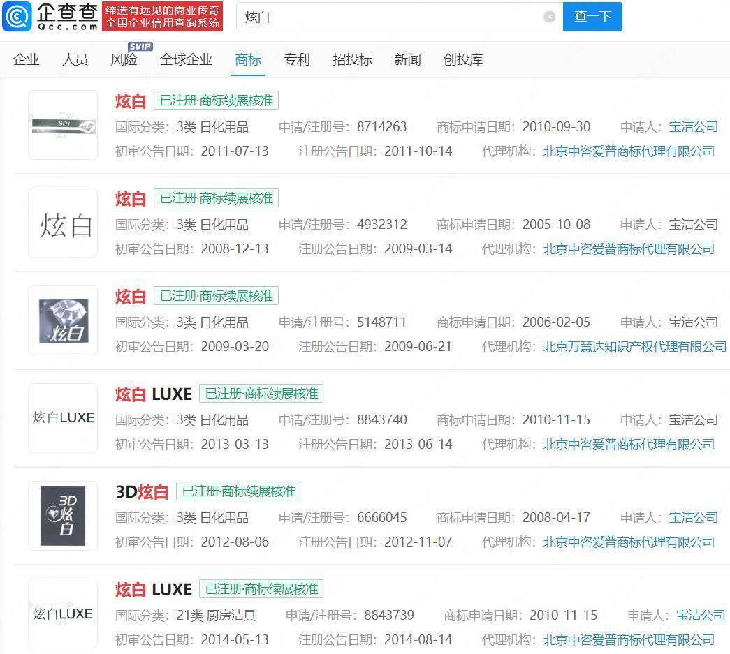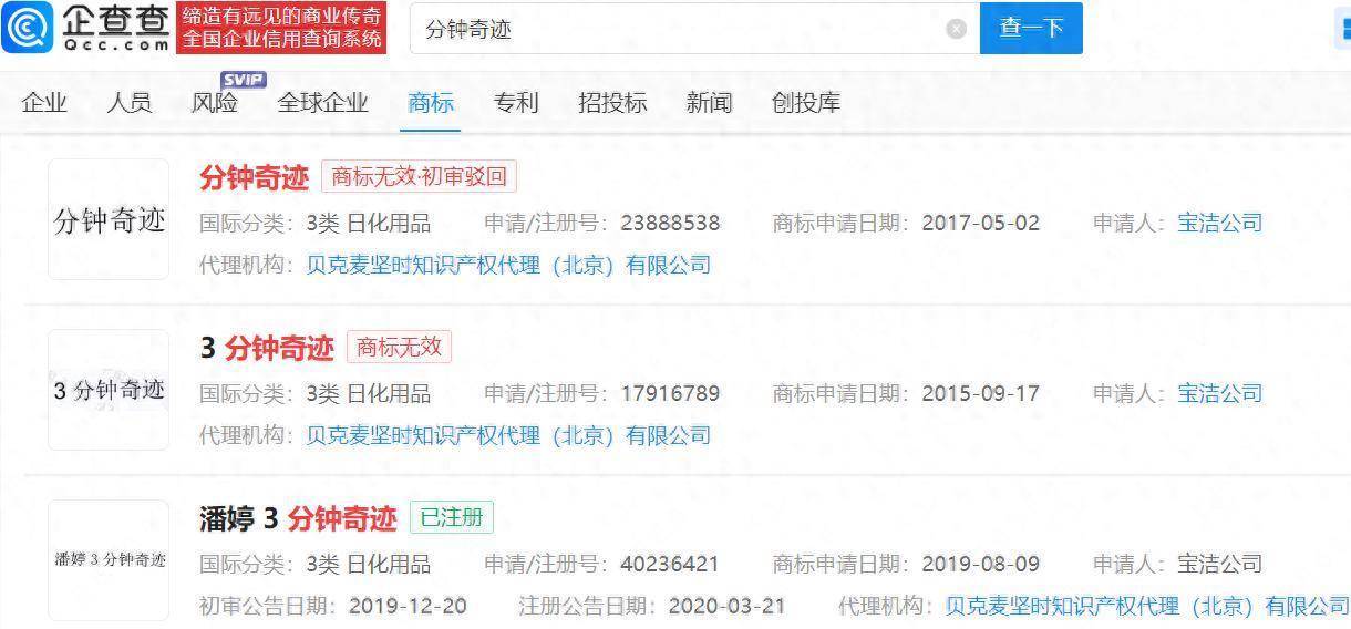 企查查显示,宝洁公司已申请注册“分钟奇迹”“3分钟奇迹”“潘婷3秒奇迹”“潘婷3分钟奇迹”商标,国际分类均为日化用品,除“潘婷3分钟奇迹”商标已注册成功外,“分钟奇迹”“3 分钟奇迹”商标申请已被驳回,均处于无效状态。企查查信息显示,宝洁公司已成功注册多枚“炫白 LUXE”“炫白”“佳洁士CREST3D炫白”商标,国际分类涉及日化用品、厨房洁具等。公开信息显示,佳洁士3D-LUXE闪耀炫白牙膏是佳洁士品牌推出的口腔护理产品, 亦称“小蓝钻”,定位为结合美容理念的美白牙膏。(信网记者)